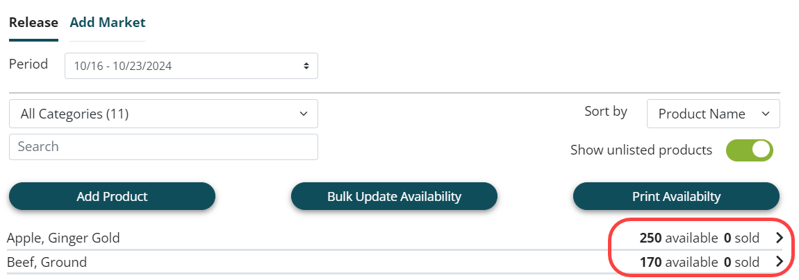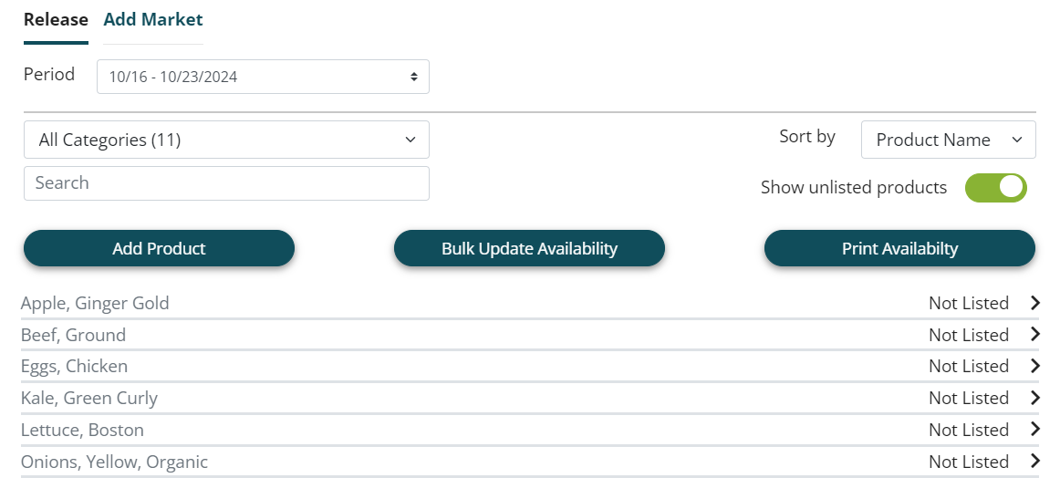 The quickest way to get your products listed for sale is to click the name of your market at the top of the Sell Page and then click the Bulk Update Availability button.