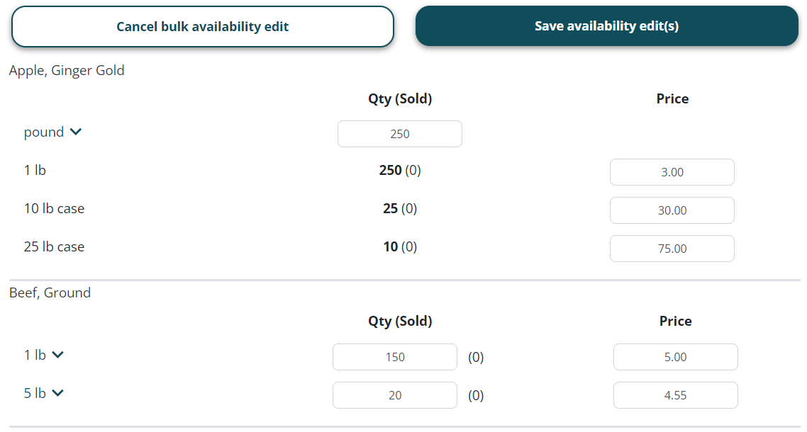 You may find that some products, like the apples above, have only one quantity field for multiple selling units. That's because they are set up as "Type A" products, meaning the quantity available is listed in terms of base units and each selling unit uses up a set number of those base units. For example the apples are listed in pounds, and each selling unit uses up a different number of pounds. For more information about product set up see Key Product Terms. If any of your products have already been sold on the market site, the number sold will appear in parentheses.