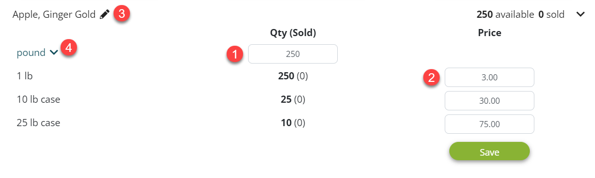 If you only need to update the one or two products you can do that by clicking on the product name to reveal the quantity available fields1;and the price fields2. If you click on the pencil icon3 by the product name you can edit the product details. If you click the down arrow4 by the product unit you can quickly unlist the product, which removes it from the market storefront.
