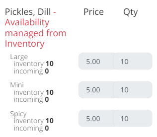 Markets that hold inventory can turn on a setting to make inventory quantities visible to producers. All products on the Sell page will then show how much product is in inventory and how much is scheduled to be delivered on purchase orders. Inventory is visible on the individual market tab, not on the All Markets tab.