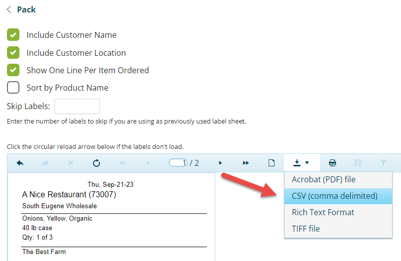 A new export-only report is available from the Pack page which takes the place of the "Export Labels" report from the Local Food Marketplace legacy producer interface. This report can be used to create custom product labels and provides all possible product information you may need. To get the complete export click the printer icon on the Pack page and select either of the label options. Once the labels have generated, use the download button to export a csv file with all the label data. Check the "One Line per Item" option if you want the export to have separate numbered lines for each unit of a product (1 of 2, 2 of 2, etc).