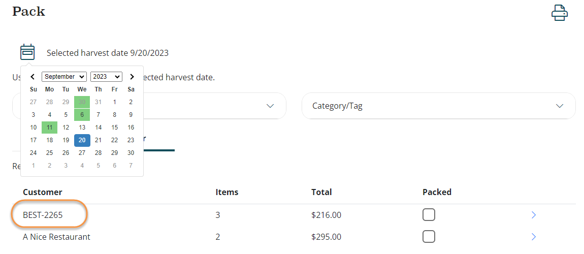 The calendar on the Harvest and Pack pages now highlights Harvest Days that products in them. This makes it easier to quickly see which days you will need to harvest and pack products.