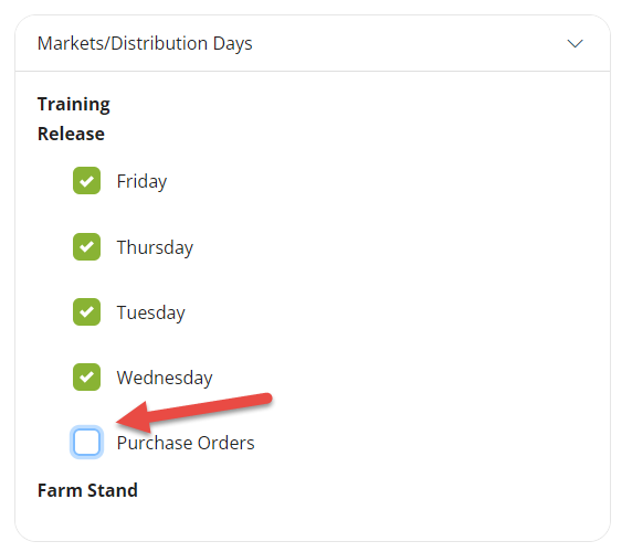 Purchase order products will be integrated in the Harvest and Pack pages and the reports generated from those pages. You can filter purchase order items out of the pages and reports by unchecking Purchase Orders in the Market/Distribution Days filter.
