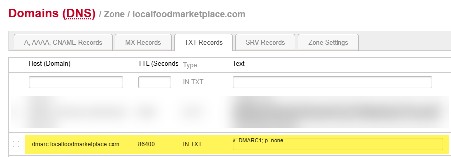 1. Create and save a TXT record in your DNS with a host of _dmarc.yourdomain.com* and a value of v=DMARC1; p=none