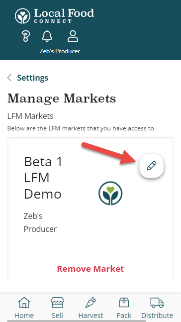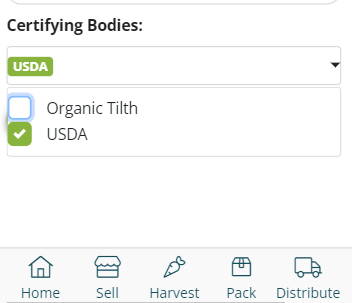 If an LFM market you sell through has set up a list of Certifying Bodies that provide certification of producer practices, you can claim certification by those organization in Connect. Click on the person icon and select Settings. Go into Manage Markets and tap the pencil icon on the market you want to claim certifications for. At the bottom of your Info tab is the drop down menu of certifying bodies you can select.