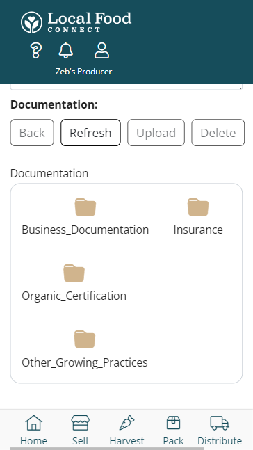 You can now upload documents to your producer profile which can then be accessed by admins of the LFM markets you participate in. To upload your documents click on the person icon and select Settings, then Manage Markets. Click the pencil icon of the market you want to share documents with. At the bottom of the Info tab is the Documentation section with four folders available: Business Documentation, Insurance, Organic Certification, and Other Growing Practices.