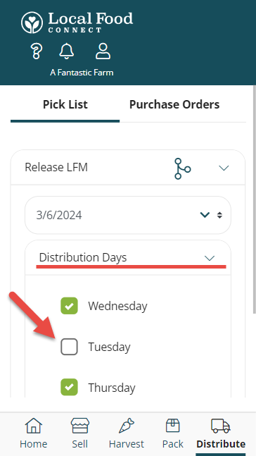 When a producer prints their Pick List from the Distribute page, only the subperiods they participate in will be selected and included by default. To see Pick List products they may have in subperiods they don't participate in they will need to expand the Distribution Days drop down menu and select the additional subperiods.