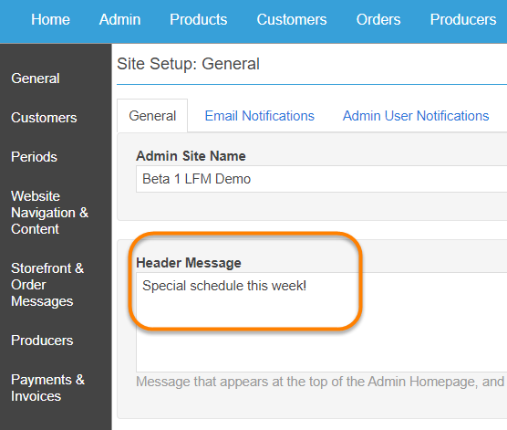 Your LFM market admins can now set up header messages in their market admin sites which will appear at the top of your Home page. In the market admin site the header message is entered at Admin>Site Setup>General>Header Message.