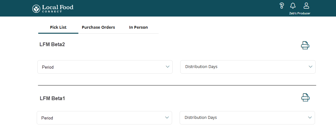 The Distribute page Pick List tab has been redesigned to expose the Period and Subperiod dropdown menus to make Pick List creation quicker and more intuitive. We replaced the "share" icon with a "print" icon to generate the pick lists.
