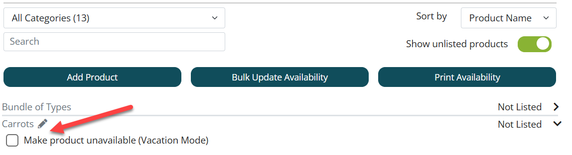 Individual products can now be set as "on vacation/unavailable" on the Sell page. This allows you to remove a product from active sales without de-listing it. Then when you turn off vacation mode on the product it returns to the storefront with the same quantity available.