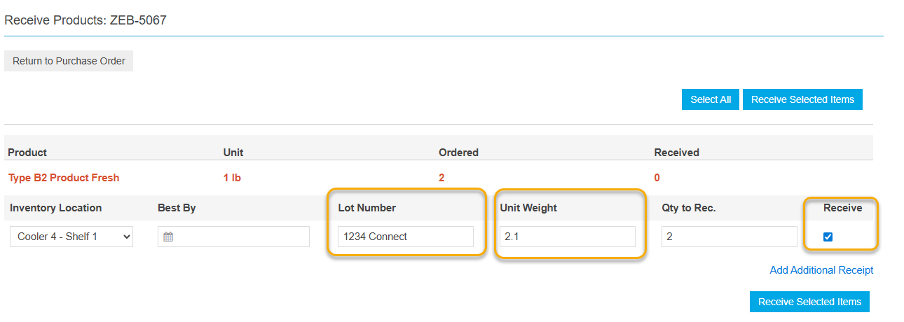 In the food hub admin site, the PO receiving page will show which products the producer has marked Packed, and what if any lot number and weight they have entered. If the food hub admin receives the product as is, it will be stored in their inventory with the producer-entered lot number and weight, and that information will follow the product onto customer orders. Note that in the food hub admin PO receiving page, the weight displayed is the weight per unit, so it will be the total weight entered in Connect divided by the quantity.