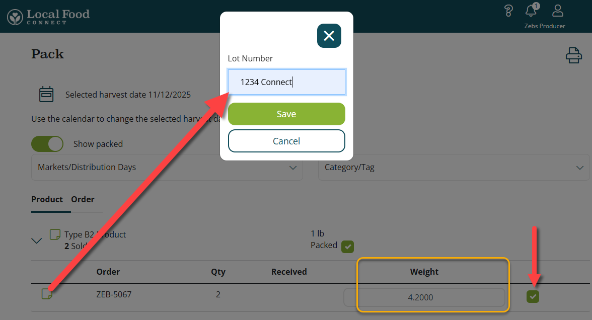 Once products have been received in by the food hub admin, the weights will not longer be editable in Connect and the Pack check box will be replaced with the word "Received."
