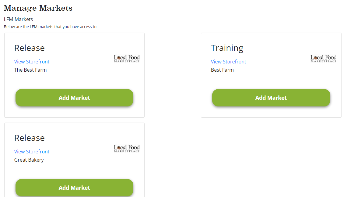 If you sell in more than one LFM market, or manage more than one producer within an LFM market, you'll need to select which market you'd like to add and manage first. We recommend choosing your primary market/profile as the first market you set up in Connect. The Product names from the market you set up first will be the names of the products you see in Connect.